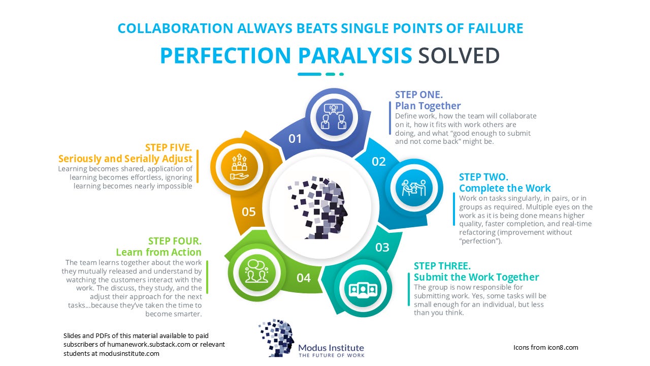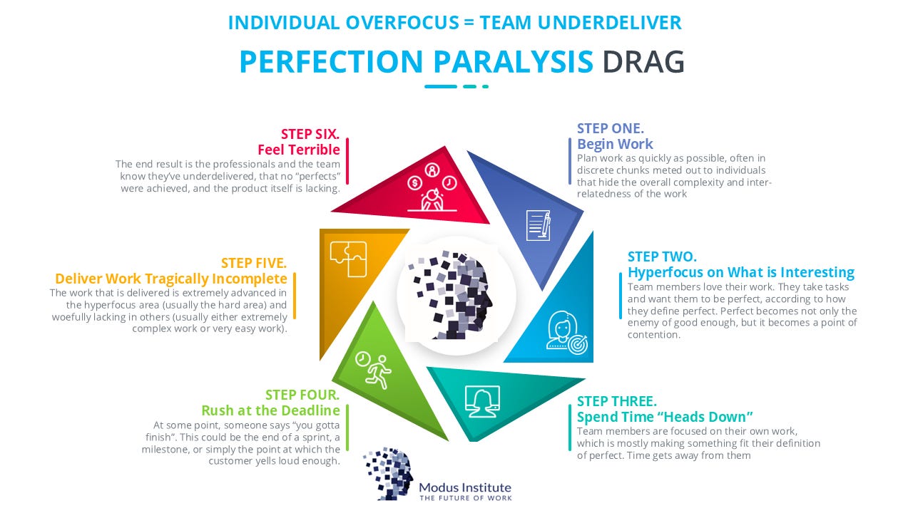 Perfectionism Paralysis Definition: The pursuit of personally defined perfect outcomes prevents completion and delivery of work, sometimes driven by fear of criticism or failure, sometimes by the process we’ve created, and sometimes by the ways individuals focus their attention. This creates both cognitive overload, work slow-downs, and systemic dysfunction while generating weird one-off bottlenecks.