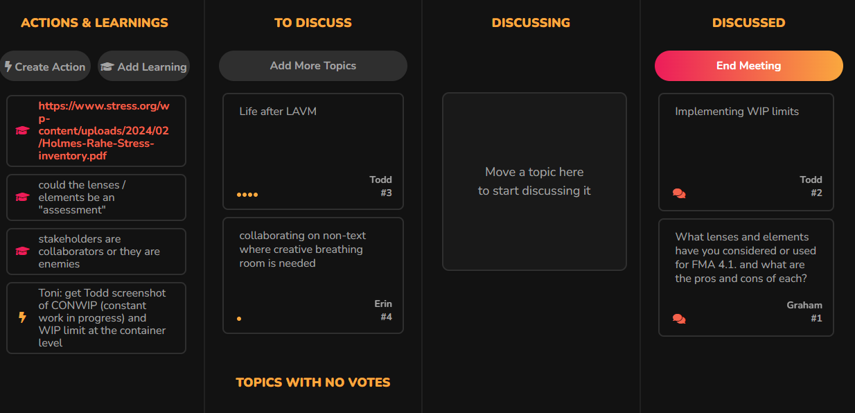 This image is from our working session today for our Visual Management (LAVM) class. In this call, where one person in attendance had already graduated, and three others were working on their final assignments (4.1), the consensus was that none of them wanted the course to end.
