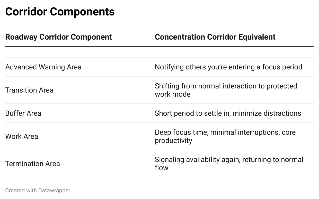 Prioritize safety and progress: In roadwork, the corridor ensures both the safety of workers and the flow of traffic. In your life, a Concentration Corridor protects your attention and progress on what matters most, while still allowing for essential communication with those you care about. One step beyond this, the psychological safety of yourself and others is enhanced and protected. Much of our psych safety issues are learned “do not approach” behaviors because we’ve been snapped at, yelled at, or other wise “something at”ed. And we do it to others. Concentration Corridors are a great way to keep people calm, therefore keep them in a humane headspace, therefore maintain psych safety.