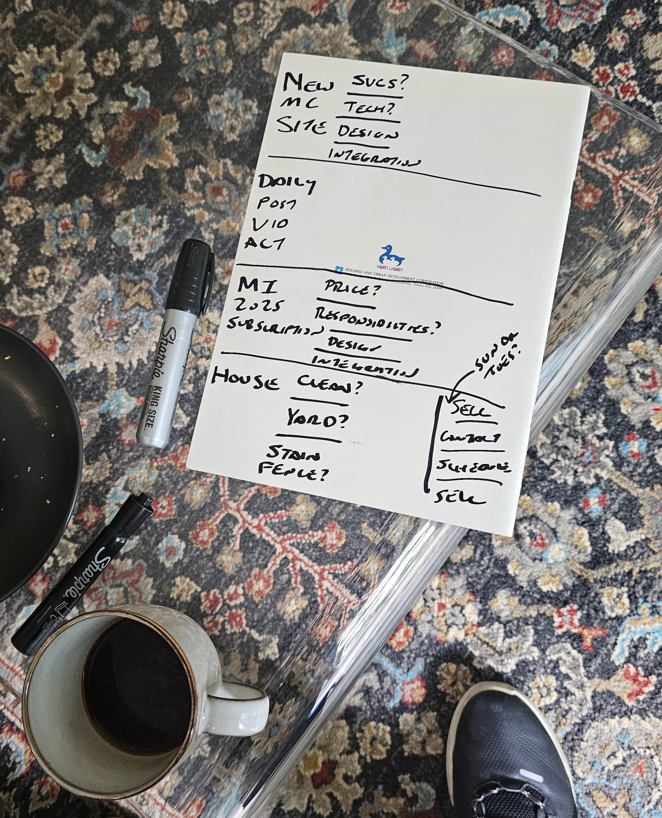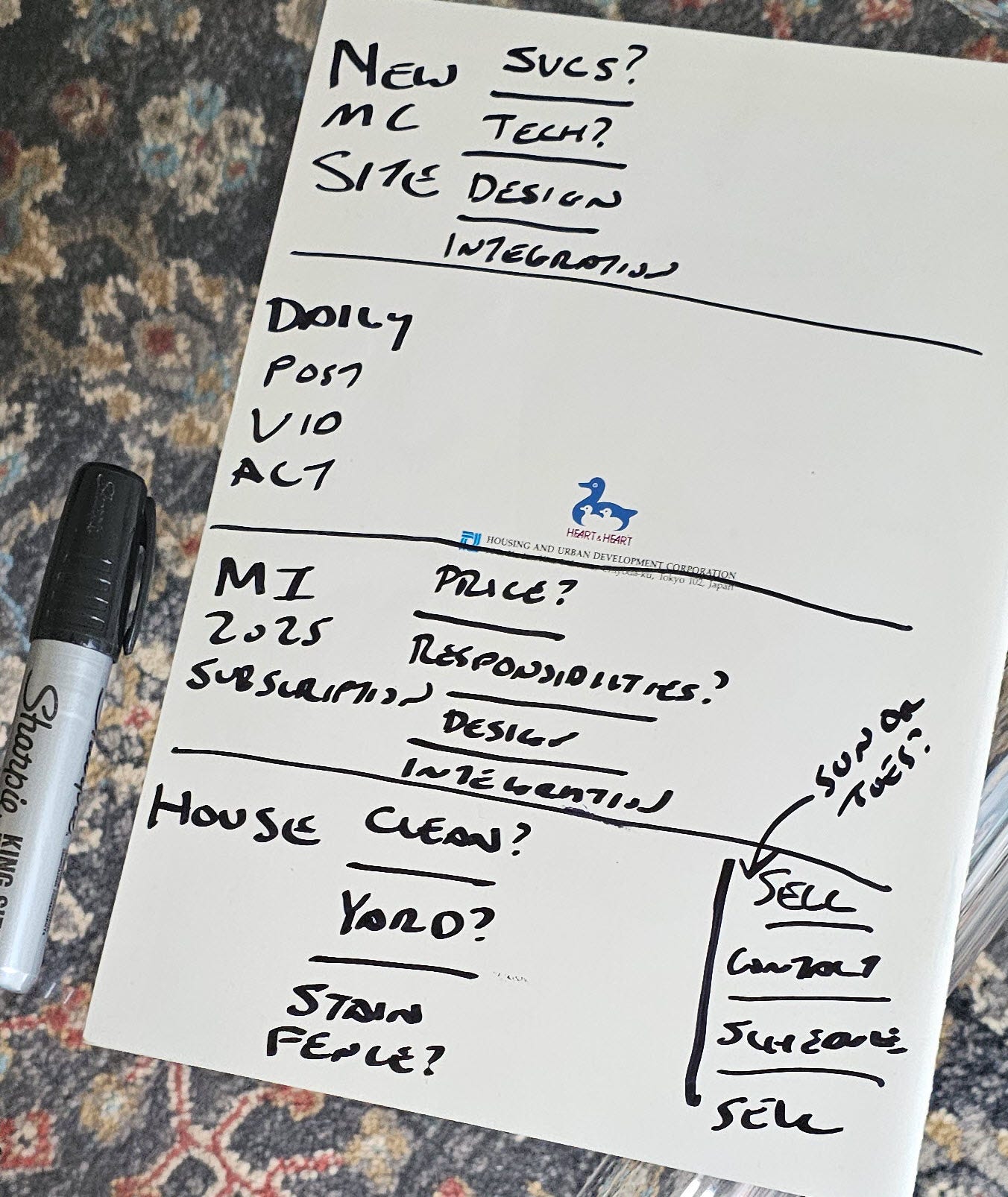 and I are working on creating these posts, building a new business model (or new layer of business model) (or models) on top of the existing work of Modus Institute and Modus Cooperandi. So just add all the stuff with my wife to Modus and the next thing you know, I’m reacting … loudly … when people ask if I’ve done something or if something has happened … and then being reminded that it needs to happen.Today I found myself in an AirBnB on Mercer Island with no post it notes and just a huge sharpie and many boxes of Maybe. Maybe boxes are things we couldn’t figure out if we were going to move with when we got to the move-out deadline and went to visit family. These take the shape of dozens of blue shopping bags filled with the flotsam and jetsam of 20 years of living.