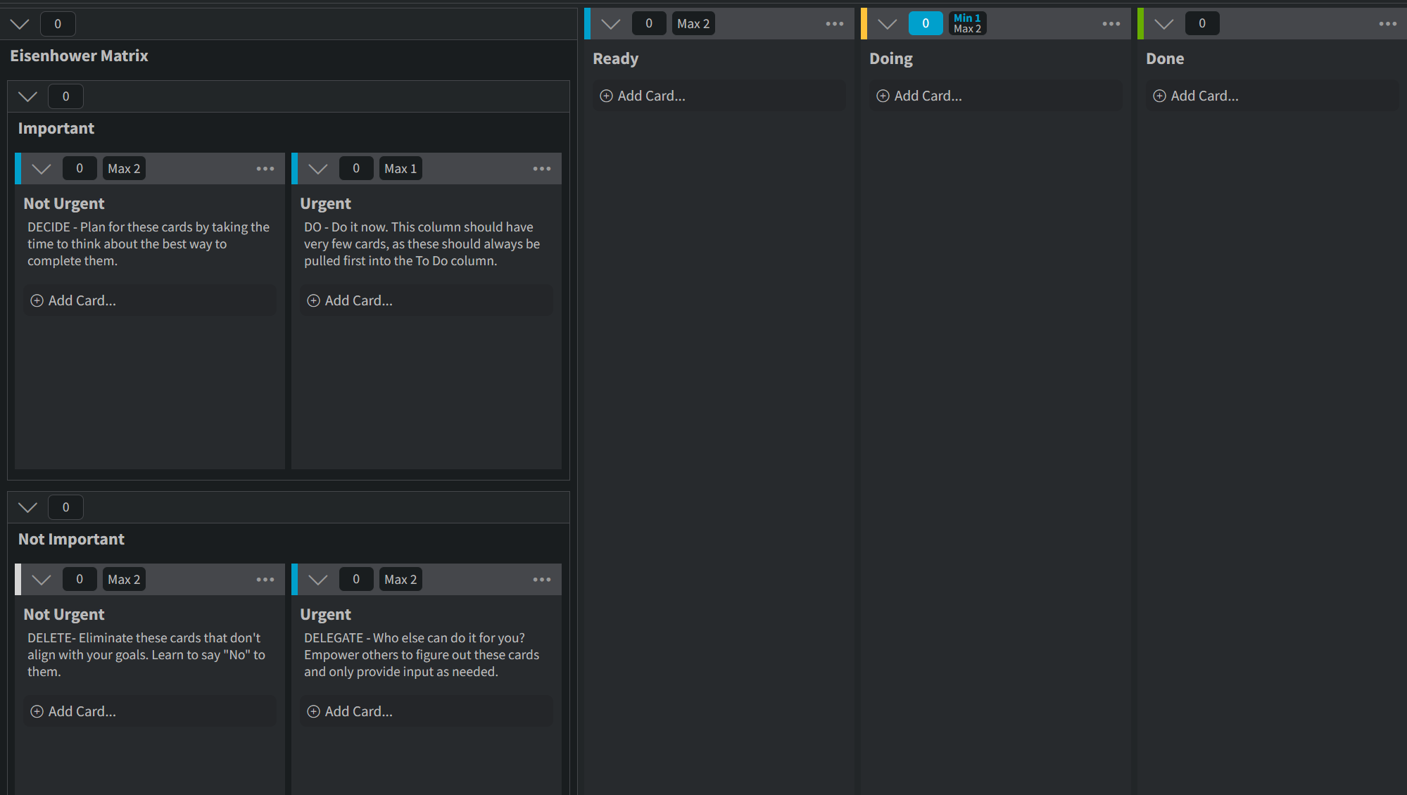 This is where Covey’s lens gets practical. In Personal Kanban, the Priority Filter can essentially be Covey’s quadrants applied to a board. Or you can create an urgent and important matrix in your own board. Before pulling work into your Doing column, run it through a filter that makes you ask…is this urgent, important, both, or neither? The pattern doesn’t just organize tasks. It forces a conversation with yourself about what is the best use of your time right now and in the future.